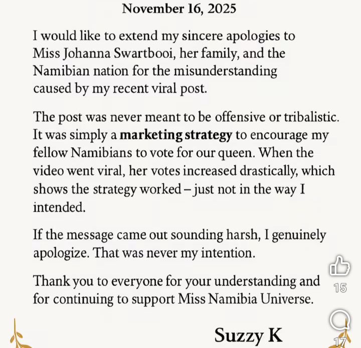 Amid the growing backlash, Suzzy K released a formal statement on 16 November, explaining that the video was intended as a “marketing strategy” meant to boost national support and votes for the Miss Namibia contestant. She admitted that the approach was poorly executed and insisted that the message was never intended to promote tribalism or disrespect.
