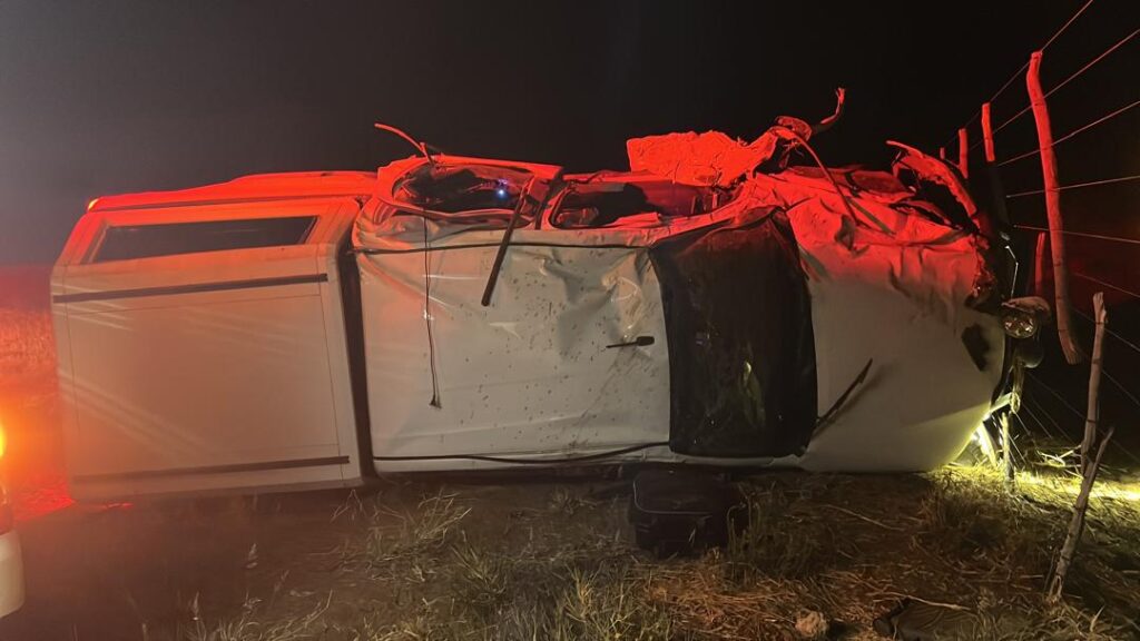 According to information from the scene, a double-cab bakkie overturned after the driver swerved to avoid a large 200-litre drum that was lying in the middle of the road, believed to have fallen from another vehicle.